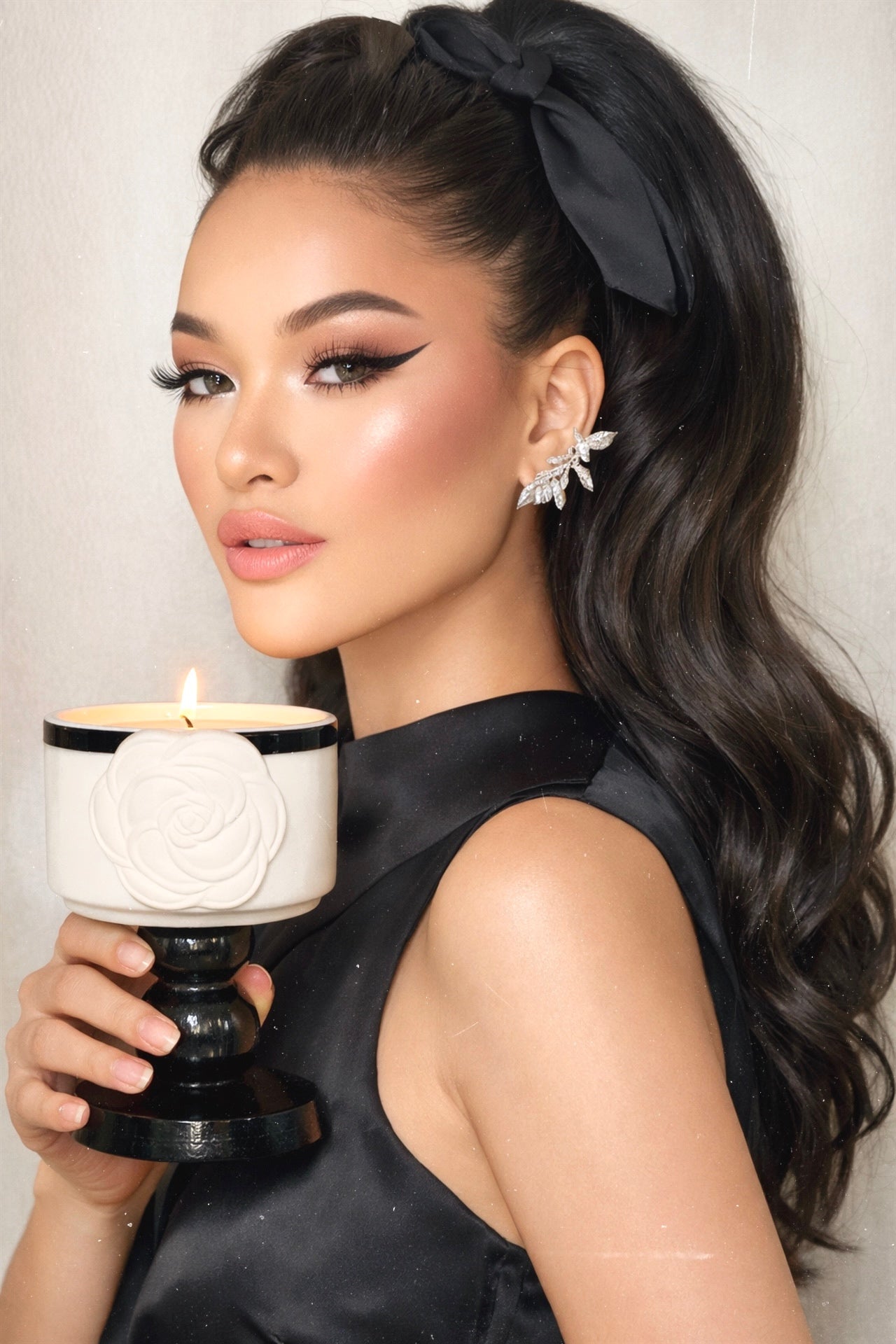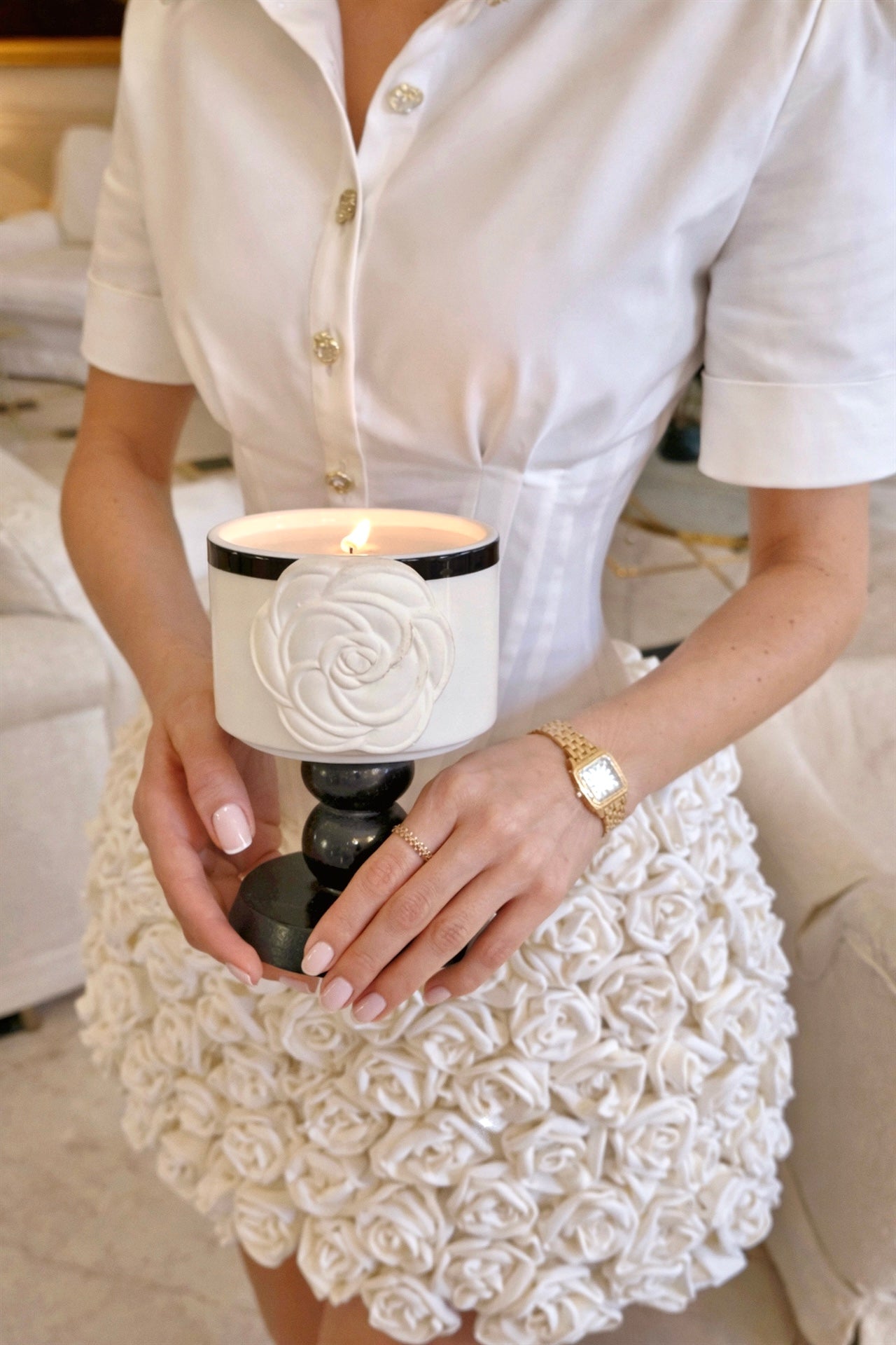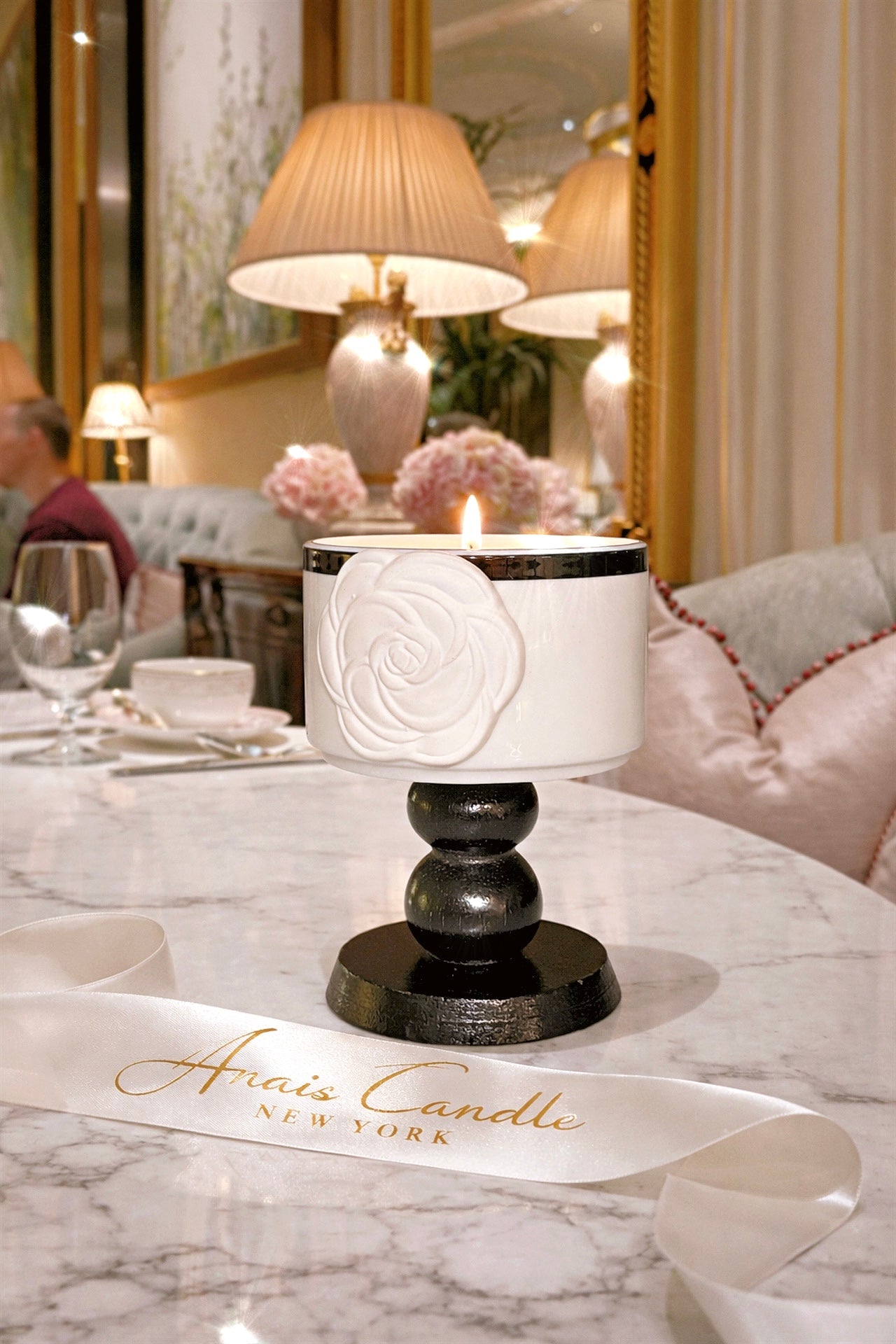 The hand-sculpted camellia and ceramic vessel evoke timeless elegance and feminine grace, while the solid natural wood base adds warmth and permanence. More than a candle, it is a collectible objet d’art, meant to be displayed, lived with, and cherished.