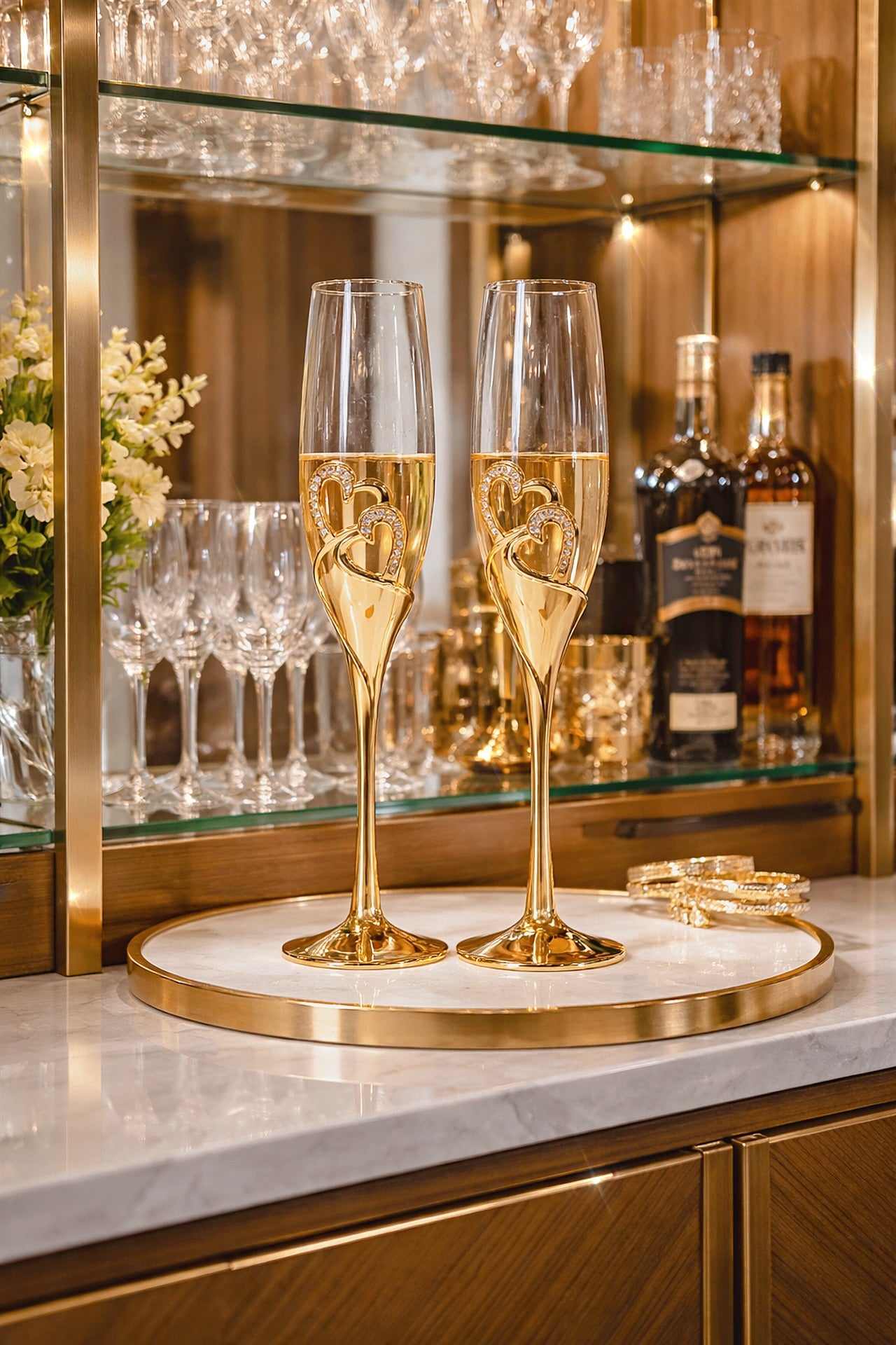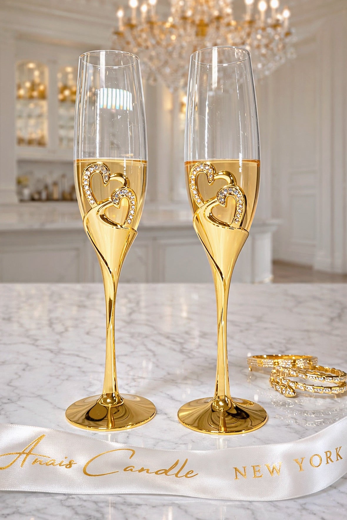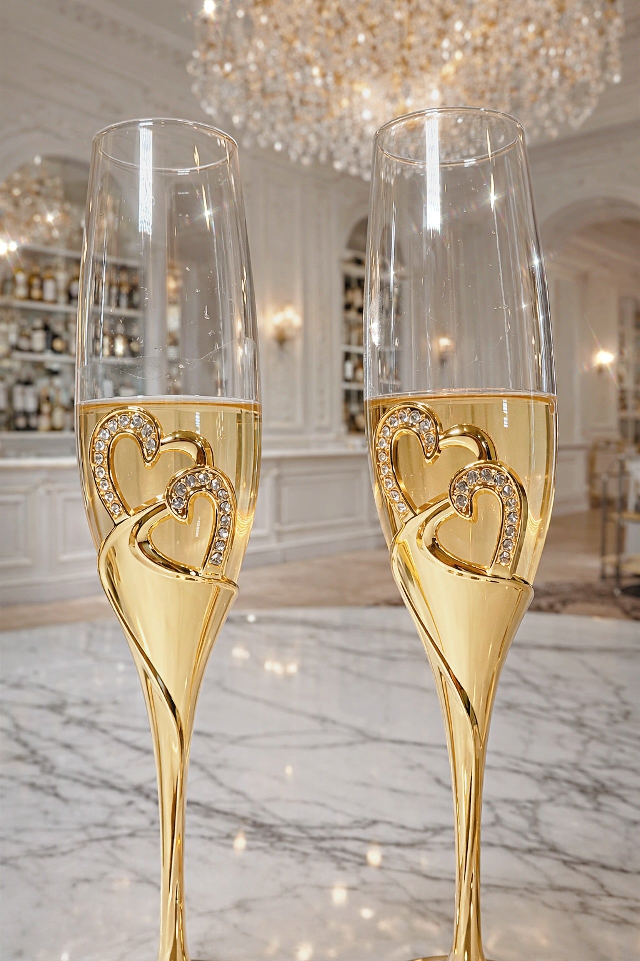 Each flute is expertly handblown from fine glass, ensuring a unique, delicate clarity that captures and reflects light with every pour. The sculptural diamond heart stem, finished in radiant gold plating, creates a striking centerpiece; symbolizing love, celebration, and timeless sophistication. Transforms every toast into an unforgettable experience.