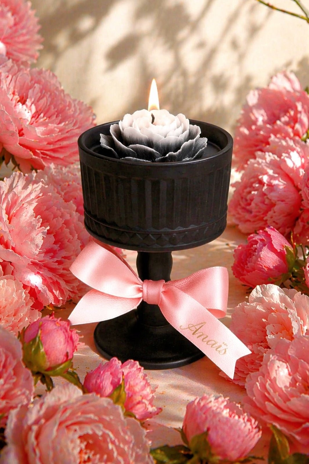 When night settles, Midnight Rose begins to glow. The flame blooms from a matte black chalice – our handcrafted ceramic container – tied with a blush satin bow. Elegant, romantic, and made for the moments you want to remember.